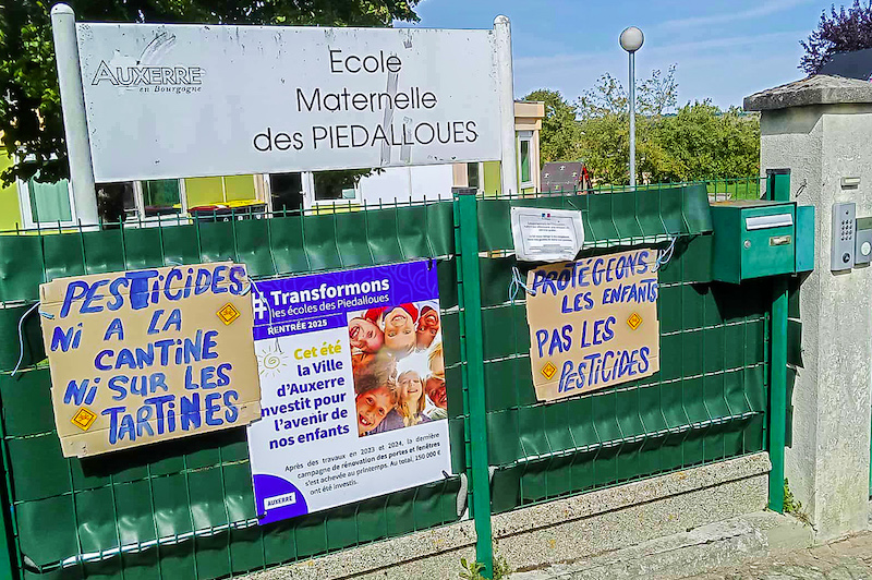 Du 1er au 8 septembre, dans le cadre des actions décentralisées du début de chaque mois de la campagne Changement de Régime, le Groupe Local de Auxerre a alerté contre les pesticides sur les routes des vacances avec une action symbolique devant des établissements scolaires.