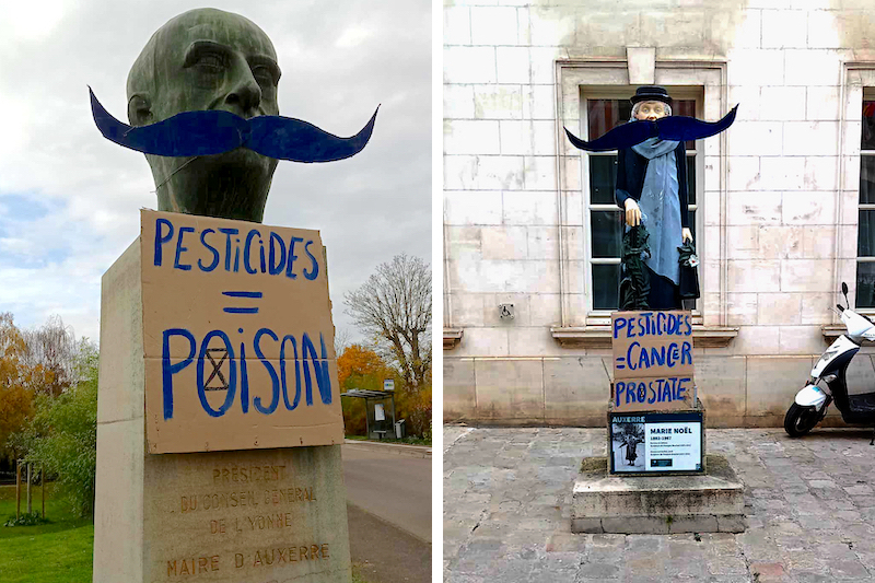 Quatre statues emblématiques du centre-ville d’Auxerre se ont été affublées d’une moustache bleue. Cette initiative s’inscrit dans la campagne nationale “Changement de Régime” menée par Extinction Rebellion, qui dénonce l’empoisonnement général de nos corps et de nos écosystèmes par les pesticides. Chaque début de mois, une action locale vise à interpeller les citoyennes et citoyens sur les liens entre santé publique, pollution chimique et effondrement du vivant.