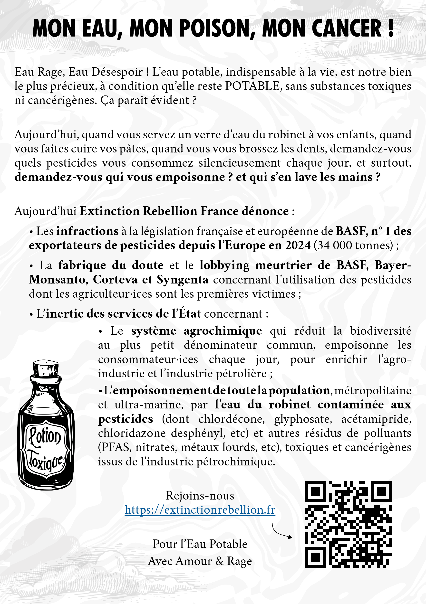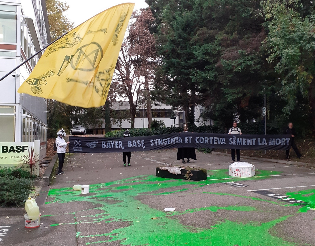 C’est pourquoi Extinction Rebellion interpelle à la fois l’État — garant de la protection des citoyen·ne·s — et les géants de l’agrochimie (Corteva, Gowan, BASF, Bayer-Monsanto, Syngenta), dénoncés pour leur lobbying agressif et leur responsabilité dans cet empoisonnement collectif.