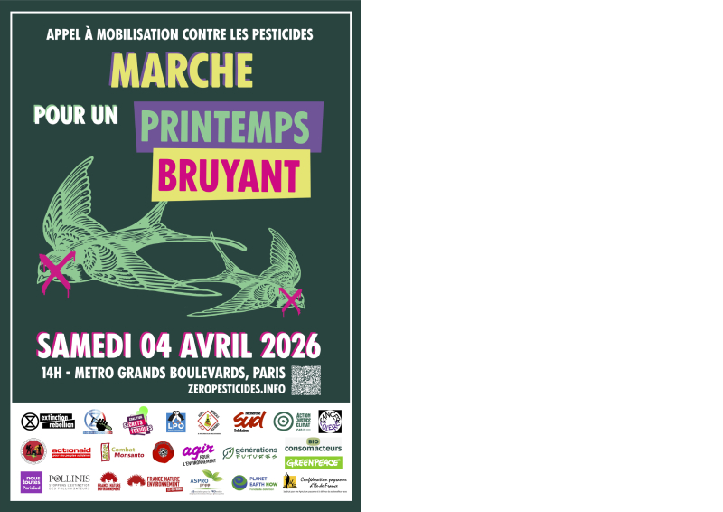 Extinction Rebellion, Scientifiques en Rébellion, Coalition Secrets Toxiques, Alerte Médicale sur Les Pesticides et Perturbateurs endocriniens, Sud Recherche, La Confédération Paysanne, Cancer Colère, COAADEP, ActionAid France - Peuples Solidaires, Combat Monsanto, Coquelicots de Paris, Agir pour l’Environnement, Générations Futures, Greenpeace France, Nous Toutes Paris Sud, POLLINIS, LPO - Ligue pour la Protection des Oiseaux, France Nature Environnement, France Nature Environnement Île-de-France, Planet Earth Now, Association de Promotion des Préparations Naturelles Peu Préoccupantes, Action Justice Climat, Bio Consom’acteurs, appellent à marcher contre les pesticides le samedi 4 avril 2026 à Paris.